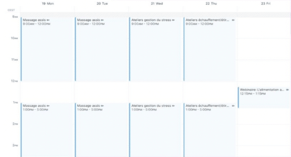 Vendredi : Webinaire de clôture de la semaine réalisé en interne pour échanger sur cette semaine, sur les conditions de travail et récupérer des informations pour l’éventuelle mise en place d’actions QVT régulières.