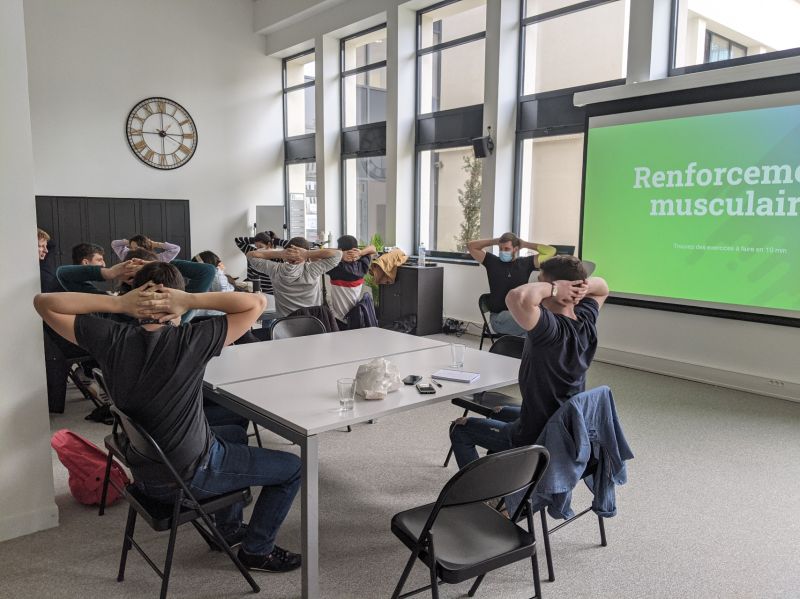 2/3 – Une position tenue trop longtemps devant un bureau peut être catastrophique à la longue. L’atelier étirement travail sur écran réduit les risques de maladies ; on y apprend des étirements à pratiquer sur le lieu de travail. C’est aussi le but de l’atelier gestes et postures qui propose de comprendre l’effet de nos postures sur notre corps, et d’en éviter les dangers.