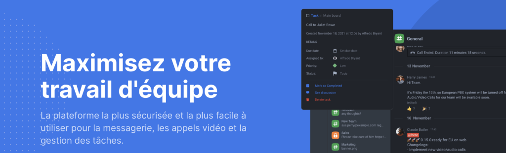 Il combine la messagerie instantanée avec des fonctionnalités de gestion de tâches, permettant aux équipes de rester organisées tout en communiquant efficacement. Les utilisateurs peuvent créer des canaux de discussion, des mentions et des fichiers partagés facilement.