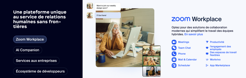 Zoom est une solution de visioconférence très populaire qui offre des réunions virtuelles de haute qualité, adaptées aussi bien aux petites réunions qu’aux grandes conférences.