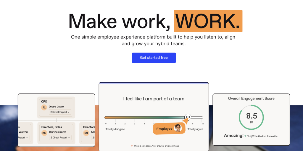 Fonctionnalités clés : Sondages d’engagement, feedback anonyme, gestion du stress, outils de reconnaissance, analytics RH.